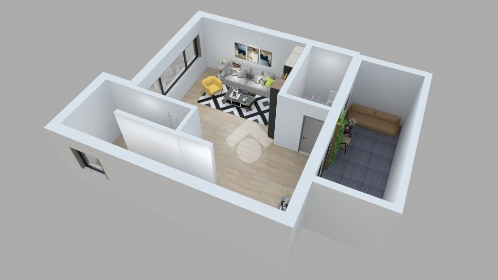 L'ingresso principale è caraterizzato da un terrazzo abitabile, coperto, rialzato rispetto al giardino, in corrispondenza dell'atrio, della sala da pranzo, della cucina e sicuramente ideale per pranzi e cene all'aperto con amici e familiari.